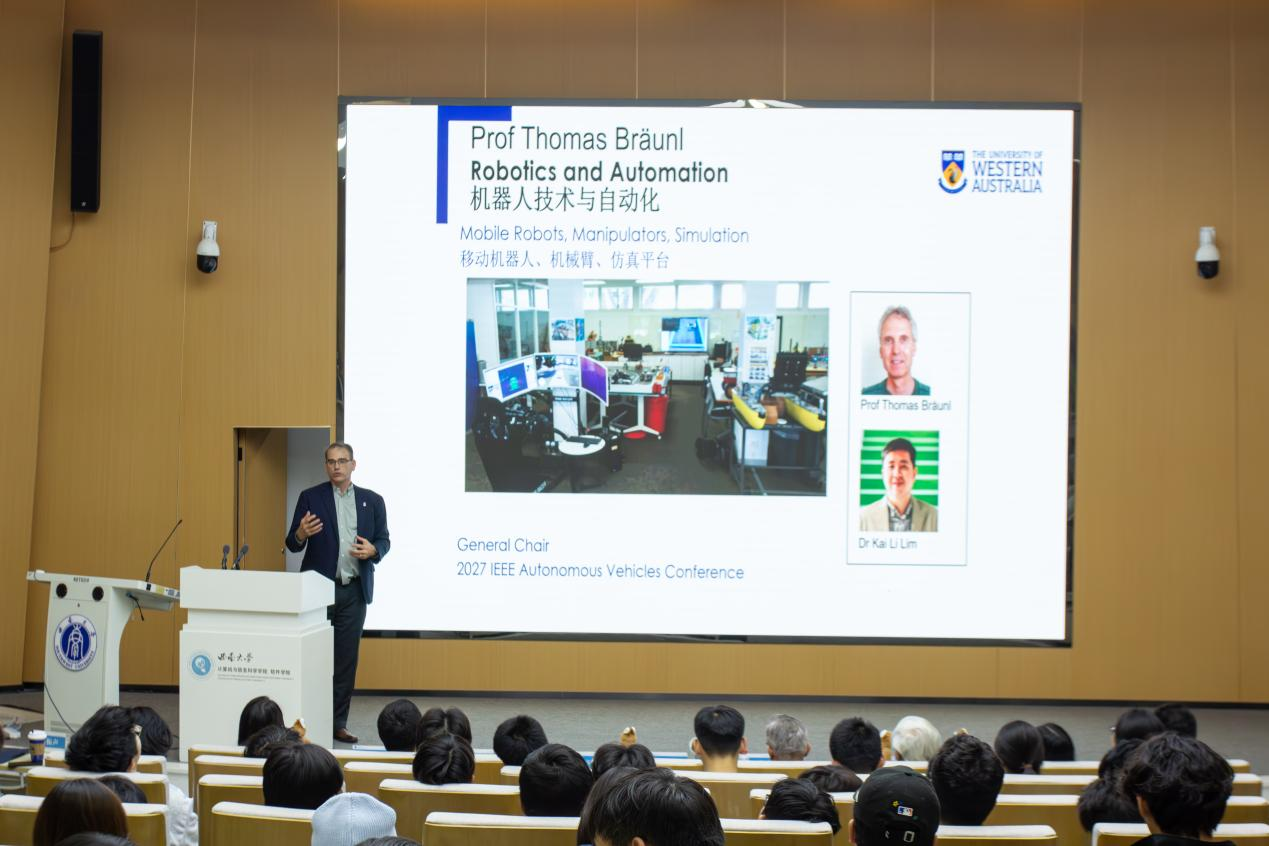 交流会上,Tim Sercombe教授从西澳大学学科优势、国际合作路径、教学资源配置、就业发展前景等方面作了详细介绍。他表示,西澳大学工程学科位列全球前100强,拥有先进的EZONE创新技术中心,配备无人机开发、自动驾驶模拟驾驶舱等先进设备,专业实力雄厚,能够为学生提供强有力的专业发展支持。西澳大学将与西南大学继续携手推进本硕连读项目,共建前沿专业选修模块,持续为学生提供国际化的学术培养与实践平台,希望自动化专业学子能够把握机遇,在跨学科学习中实现全面成长。