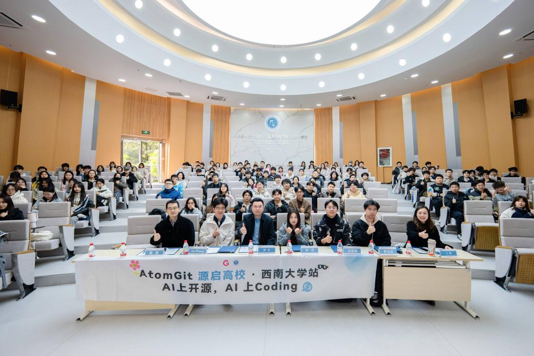 12月5日下午,AtomGit“源启高校”西南大学站活动在学院一楼报告厅成功举办。本次活动以「AI 上开源,AI 上 Coding」为主题,吸引了近两百名师生及技术爱好者参与。活动现场不仅设有技术专家交流环节,还为同学们提供了实习、校招直推及免笔试直通卡等宝贵机会。