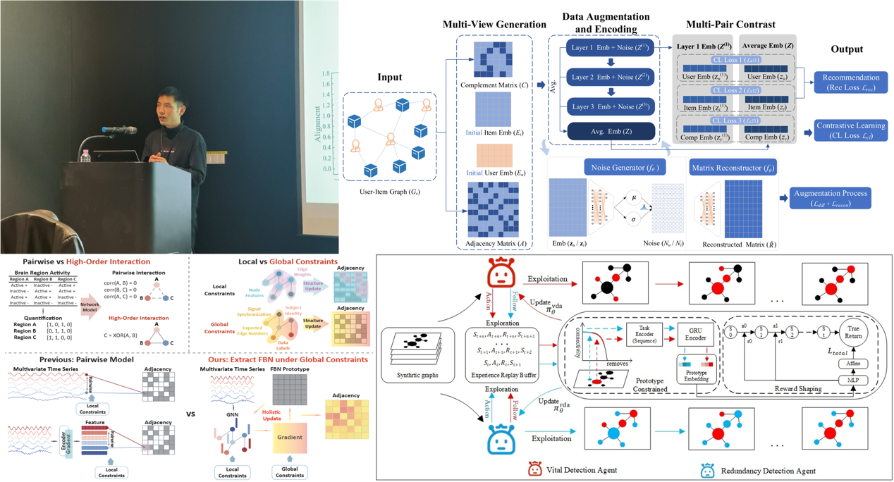 左上:博士生王岩松在CIKM口头汇报工作。右上:GDA4Rec推荐框架。