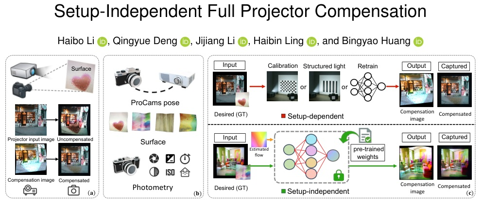 该获奖论文针对空间增强现实(Spatial Augmented Reality, SAR)中投影仪在复杂物理表面产生的几何与色彩失真问题,提出了首个“环境独立”的全投影补偿框架SIComp。现有补偿技术高度依赖固定的设备摆放和光照环境,场景一旦改变就需要重新标定或微调模型。为此,研究团队构建了包含277种真实场景的大规模数据集,并采用几何与色彩解耦的协同设计。通过定制化的在线光流模块和引入表面先验的自适应光度网络,SIComp能够精准建模系统的动态范围与表面反射率。在面对完全未见过的全新场景时,该框架无需任何微调即可直接输出高质量的补偿画面,显著提升了模型的泛化能力,为空间增强现实技术在复杂环境中的实际部署提供了通用解决方案。