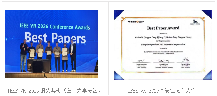 近日,由学院黄兵姚副教授指导、硕士研究生李海波为第一作者的学术论文《环境独立的投影仪全补偿》(Setup-Independent Full Projector Compensation)荣获第33届国际虚拟现实与三维用户界面会议(IEEE VR 2026)学术大会“最佳论文奖”(Best Paper Award)。这是我校首次获得CCF A类最佳论文奖。