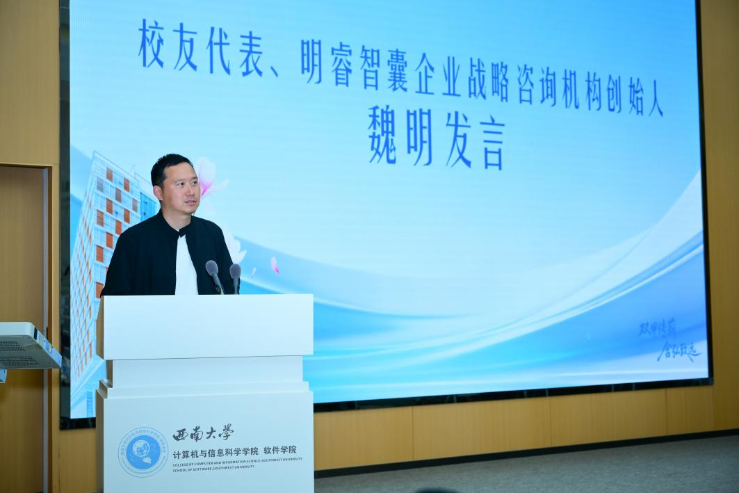 明睿智囊企业战略咨询机构创始人、1992级校友魏明深情回顾了在母校的求学岁月,感念学院的培养和恩师的教诲,表示此次回到母校真切感受到学院发展的蓬勃生机和年轻学子的蓬勃朝气。同时他也从行业发展的角度,为学院的人才培养和学科建设提出了宝贵的意见建议。