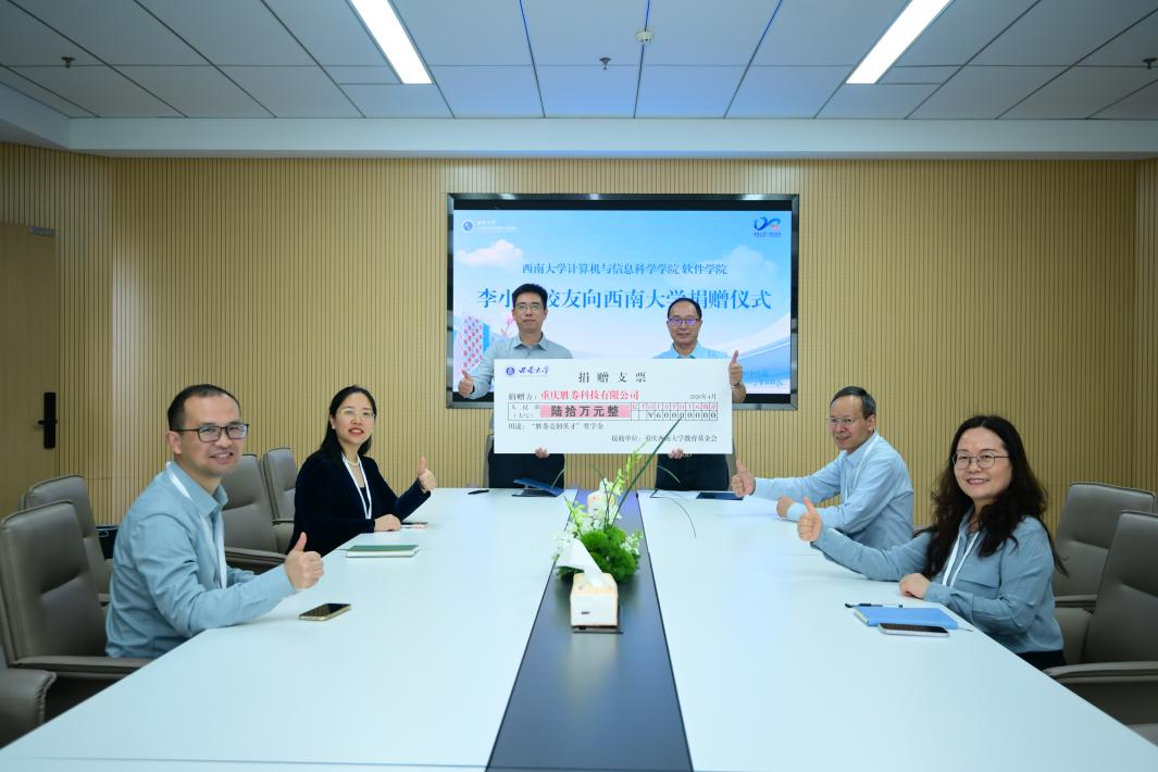 4月17日,在西南大学120周年华诞之际,重庆胜券科技有限公司总经理、1984级校友李小洪先生代表企业向学院捐赠60万元,设立“胜券竞创英才”奖学金。学院党委书记易鹏、纪委书记刘作勋、副院长李娅、副院长廖剑伟,重庆胜券科技有限公司创始人、1984级校友李小洪参加捐赠仪式。