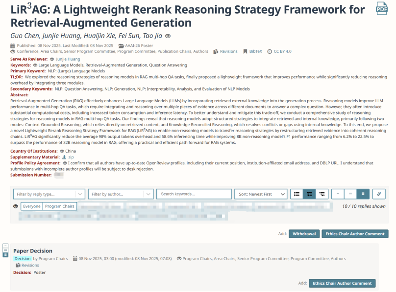 近日,学院2023级软件工程(中外合作办学)专业本科生陈果在学院黄俊杰副教授的指导下,在CCF-A级会议——The 40th Annual AAAI Conference on Artificial Intelligence (AAAI2026) 以第一作者发表了题为《LiR³AG: A Lightweight Rerank Reasoning Strategy Framework for Retrieval-Augmented Generation》的研究论文。...