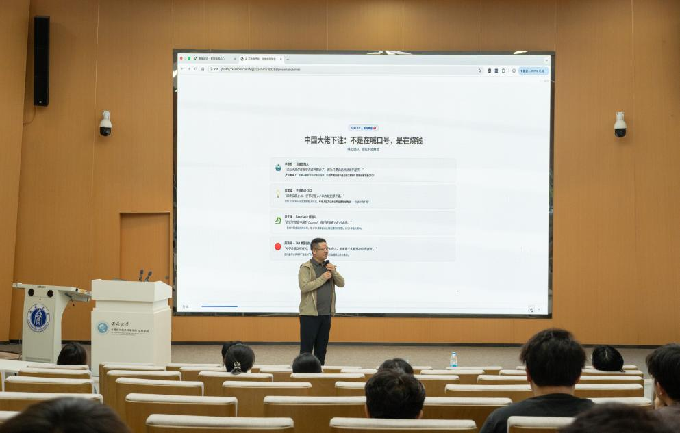 4月17日下午,2008级校友、腾讯游戏生态发展部AI技术负责人黄国平博士以“游戏大模型技术进展与行业前瞻”为题,分享了大模型如何重塑游戏开发流程。黄学长结合自身从西南大学学子到中科院博士,再到腾讯AI Lab、游戏AI研发一线的成长经历,分享了自己从自然语言处理、机器翻译转向游戏AI领域的历程。在分享中,黄学长重点探讨了大模型对游戏行业的重塑作用,细致解读了大模型在开发流程、内容创作、核心玩法创新中的应用。最后,黄学长提醒同学们理性看待AI发展:既要警惕过度依赖大模型带来的能力弱化,也要关注技术伦理问题。他鼓励同学们主动拥抱大模型浪潮,学习其底层原理,找准自身在技术链条中的价值定位,在行业变革中把握成长机遇。